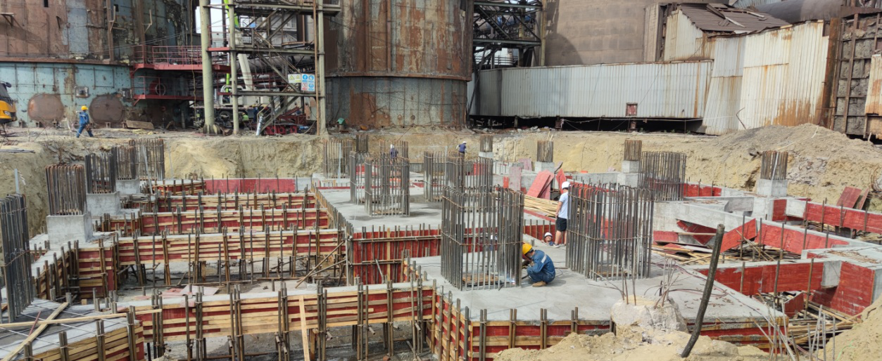 一期脫硝區(qū)域地下樁基共計(jì)38根,基礎(chǔ)承臺(tái)區(qū)域16個(gè),立柱21根其中大柱(1400x1400)11根,小柱(800x800)10根。共經(jīng)歷樁基施工及澆筑、基礎(chǔ)場(chǎng)地開挖、墊層澆筑、樁基檢測(cè)、鋼筋編制、基礎(chǔ)支模、基礎(chǔ)澆筑及養(yǎng)護(hù)、土方回填等歷時(shí)70余天。于5月16日工序交接進(jìn)入框架安裝階段。